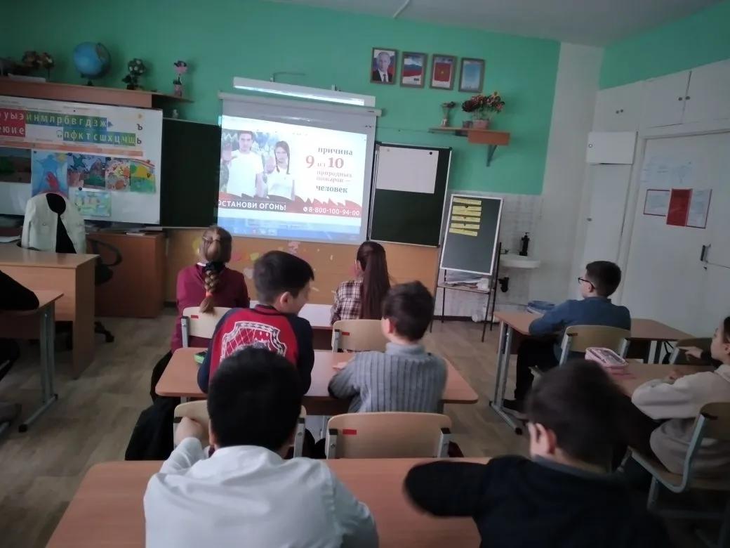 Ребята посмотрели видеоролик «Останови огонь», в котором говорилось, что 90% природных пожаров возникают по вине человека.